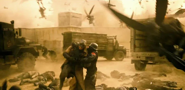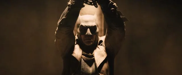 Then comes part two: Bruce awakens, still in his Batsuit, chained up next to some other people and in some sort of underground prison, apparently underneath the location of the first desert fight scene.