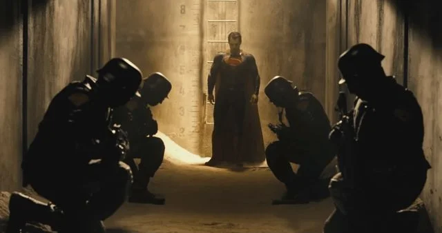Superman makes a dramatic landing, and as all the supersoldiers kneel for him as he passes — he looks very, very angry.