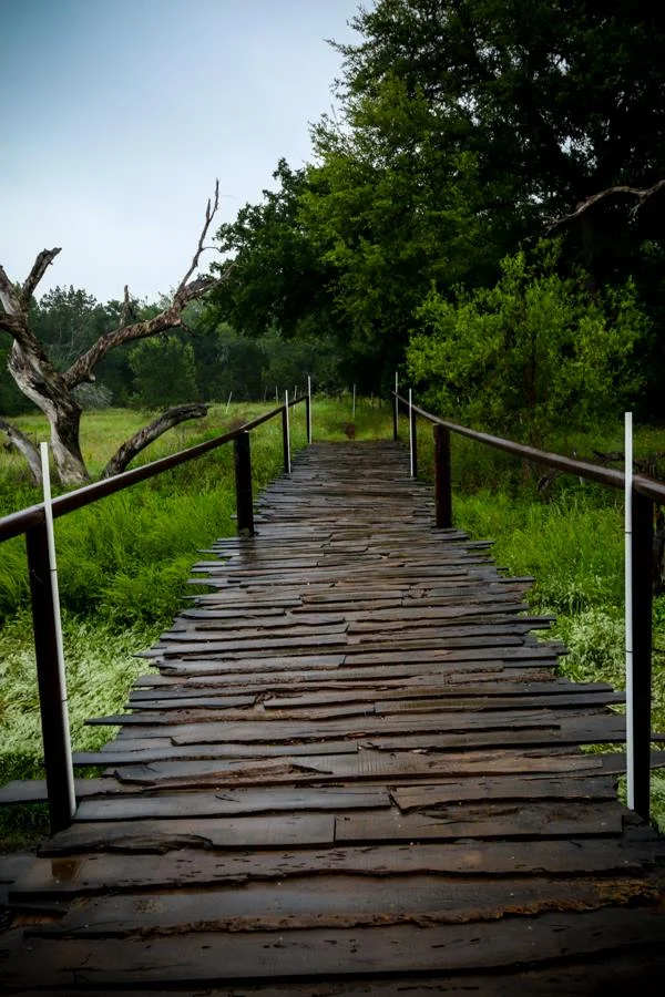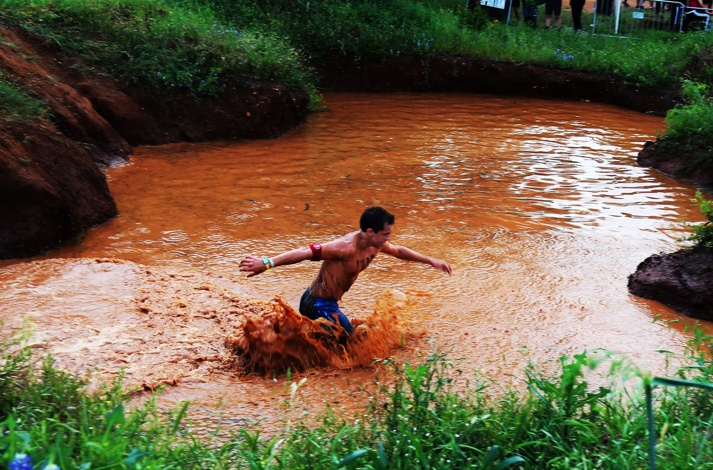 In the end, I succeeded in flipping the tire six times, but both Kevin and another runner had managed to gain some ground on me, so I needed to pick up the pace. Not too long afterwards—literally a thirty yard run after the tire flip—we found ourselves at the multi-rig, which I wasted no time shuffling across, shaking my arms out for a moment or two before grasping the angled pole and crossing the rig as quickly as possible. After ringing the bell, I took off again, ready to take on the last mile and a half. Some winding trails, some small creeks to jump—it was fairly quick-paced, and as I made my way through the mud mounds, Mr. Cory Acuff—Chris Acuff’s father—informed me that I was currently in 9th place. After the mounds, I made my way over the inverted wall and across the beautiful-looking bridge that spanned the lake on which Reveille Peak Ranch is located. After experiencing a motivational boost from some volunteers just beyond the bridge, I sped up and made my way to the Bucket Brigade.