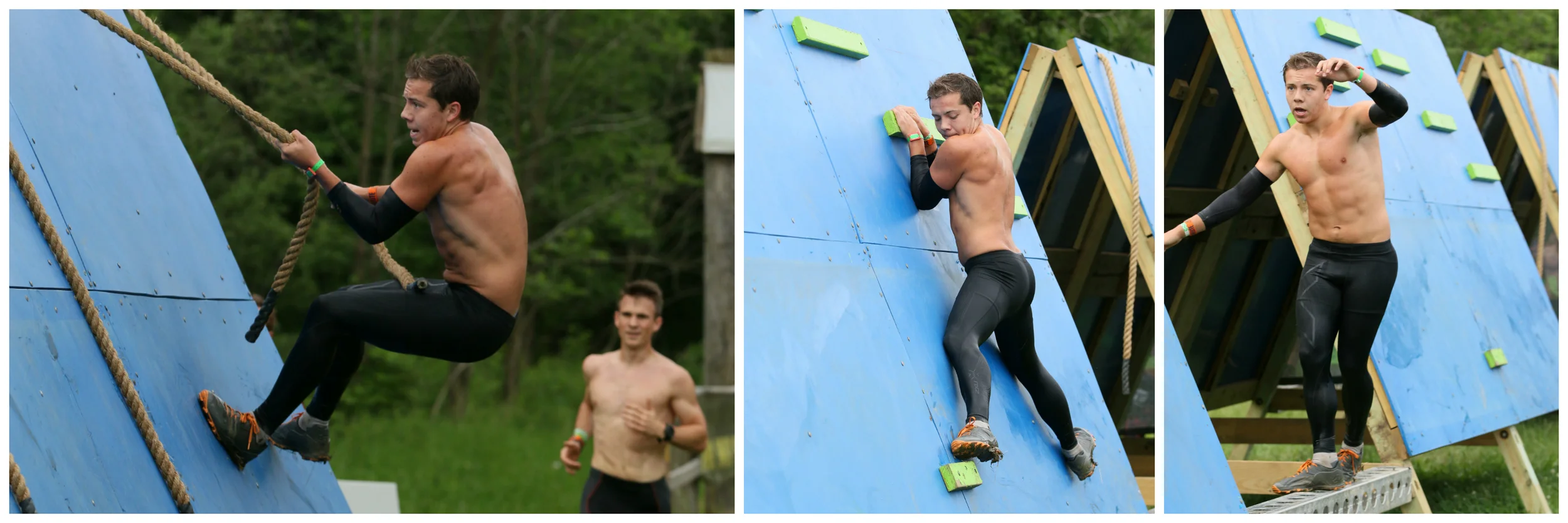 First came some an extremely muddy crawl through the Normandy Jacks, which then spilled us out into a whole lot more running. The trail grew continually more technical and, as we progressed, progressively got steeper, so that eventually we were scaling extremely steep—albeit not too tall—hills, some of which were steep enough to require rope in order to climb. Then came the rope climb, the 12’ Rope Wall, the Confidence Climb, and 60 Degrees, all of which mainly served the purpose of continuing to spread the distance between us racers. At this point I was safely in probably third or fourth, and still feeling alright. I might have started off a bit fast, but I was still feeling good.