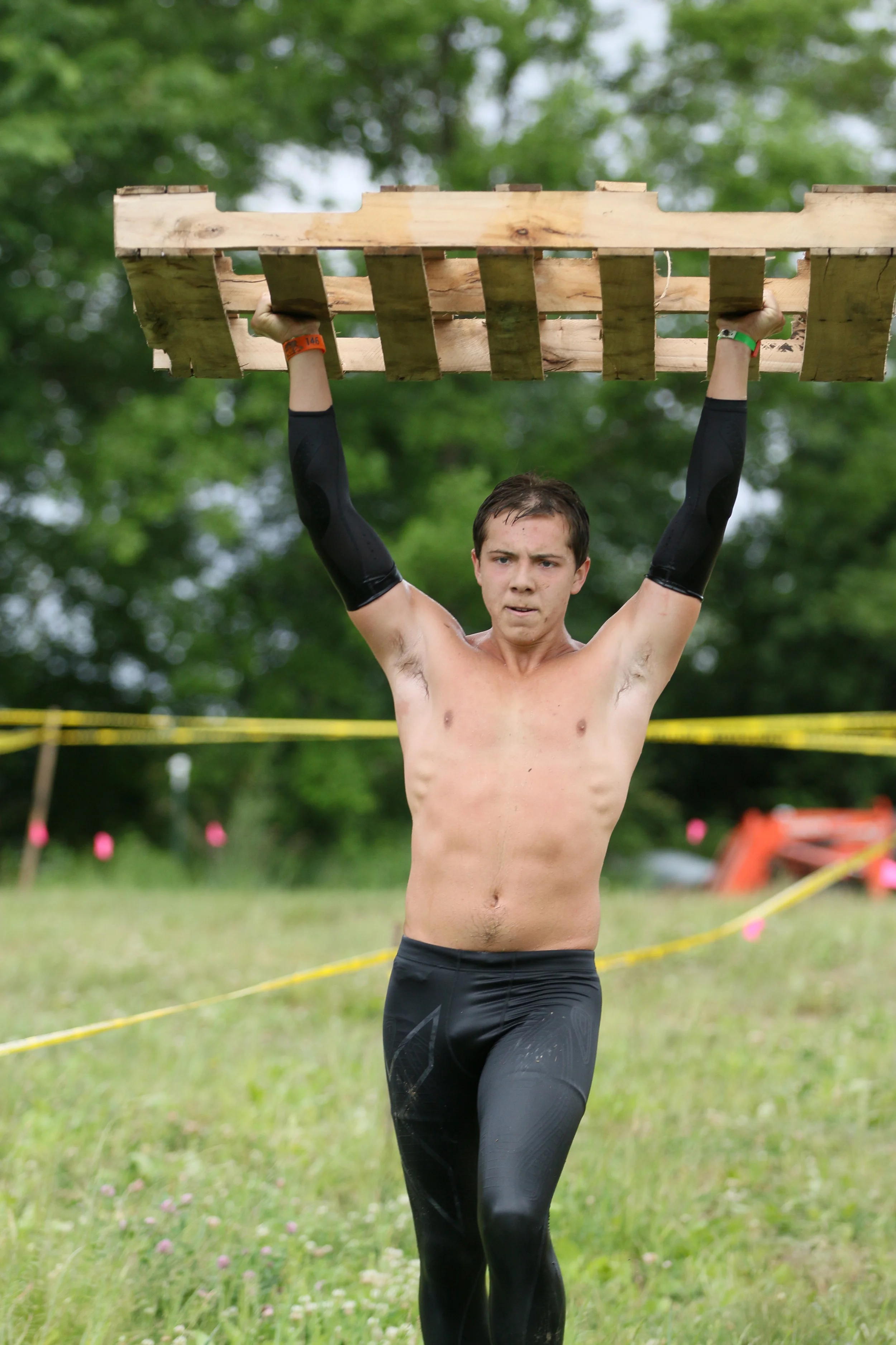Now, the Pallet Carry wasn’t listed on the course map and seemed more like an afterthought (as if, on the morning of race day, the directors were like, “Hey, a stack of pallets! We should do something with that!”), but it was a pretty awesome afterthought, if I may say so myself. Essentially, Elites were required to pick up the wooden pallets and hold it above our heads while walking along a short loop, without letting the pallet touch any part of our body other than our hands (a.k.a. don’t set it on your heads). While this wasn’t necessarily a difficult feat to accomplish, it was definitely an awkward obstacle, which can sometimes be the best because, in all honesty, they’re kind of fun. I’m used to carrying sand bags, wreck bags, and jerry cans, so changing it up was kind of cool. But who knows, maybe I’m crazy.