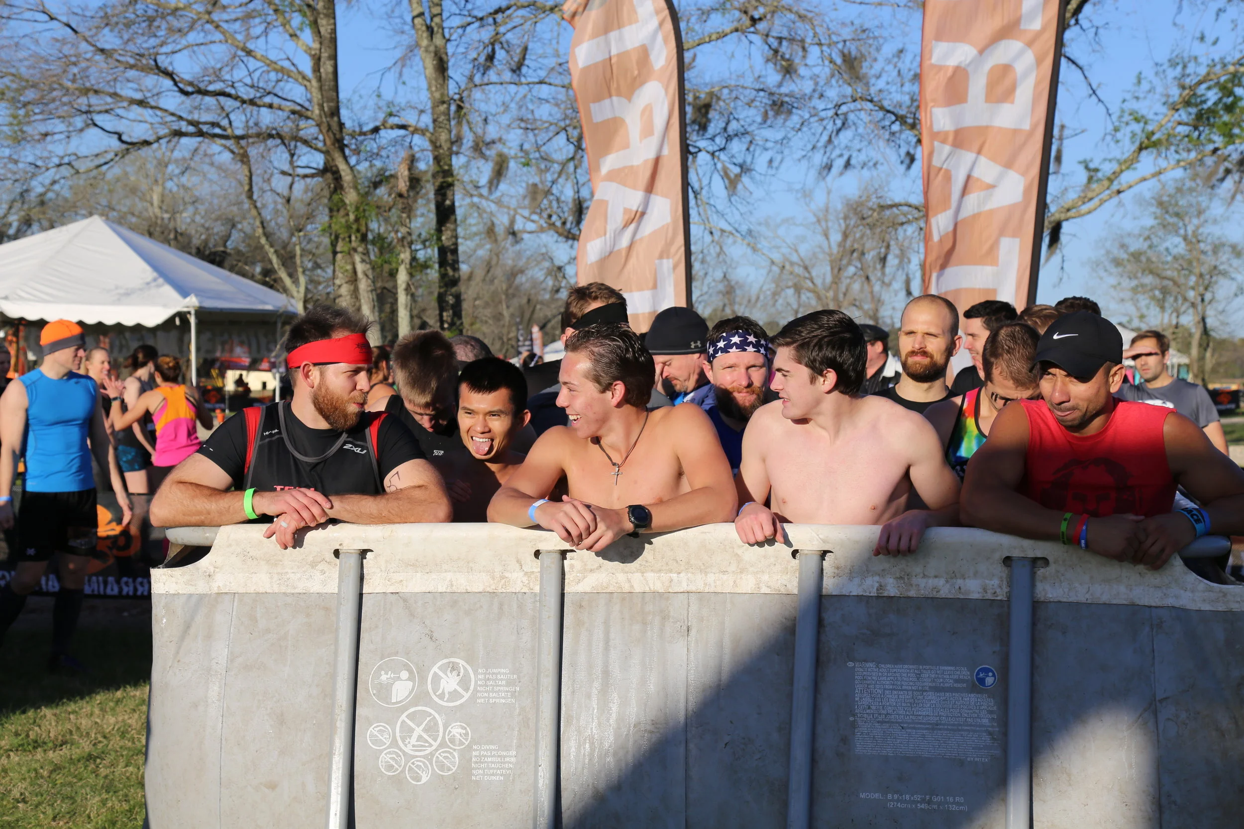 The starting corral for the race was different than any other race I’d run before, with all of us racers finding ourselves chest deep in slightly-colder-than-lukewarm, not-too-clean water, where we would remain icily until the cannon went off and we set out on the course. I got to meet up with buddies Daxton, Van, and Rich at this point, and we got to share a few laughs as we awaited the signifying cannon blast.