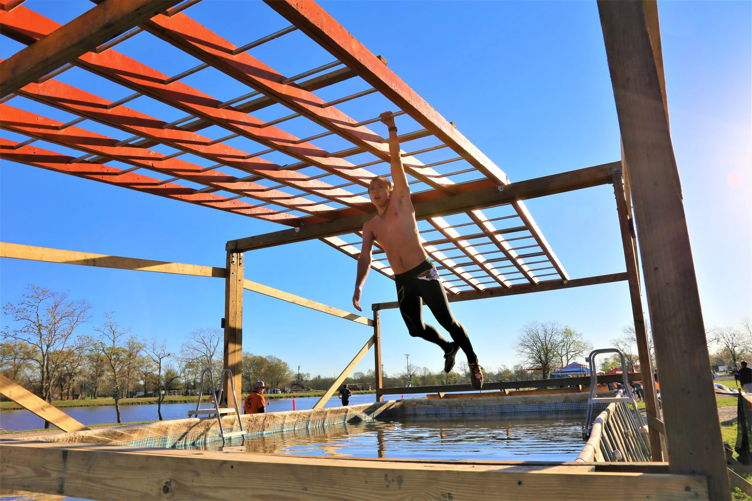 Once the cannon sounded, we were off. I clumsily face-planted my way out of the tub and scrambled back up to my feet, sprinting for a few seconds to regain the ground I’d lost in my momentary ungraciousness. I quickly placed myself next to fellow teammate David Tolstyka (@deafocr) at the front of the pack, and together we led the group for a solid half mile as we made our way over some quick walls and through a lengthy, knee-deep water sludge around the perimeters of a lake. We were deposited to a rope-climb/ladder wall hybrid obstacle, which then sent us off onto a stretch of running along the winding bike tracks that would be our stomping grounds for the majority of the rest of the race.