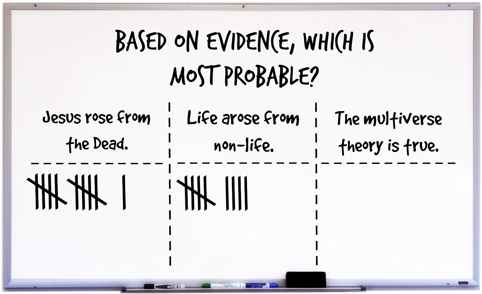 But now we reach the topic of resurrection, that which I deemed most probably as evidenced by the eleventh tally on that chart. Why do I feel so bold in my proclaiming the resurrection of Jesus Christ more probably than life from non-life or the multiverse theory? Here is why: